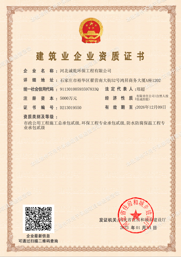2023年1月4日,河北誠(chéng)乾環(huán)保工程有限公司取得由河北省住房和城鄉(xiāng)建設(shè)廳頒發(fā)的市政公用工程施工總承包貳級(jí)資質(zhì)。